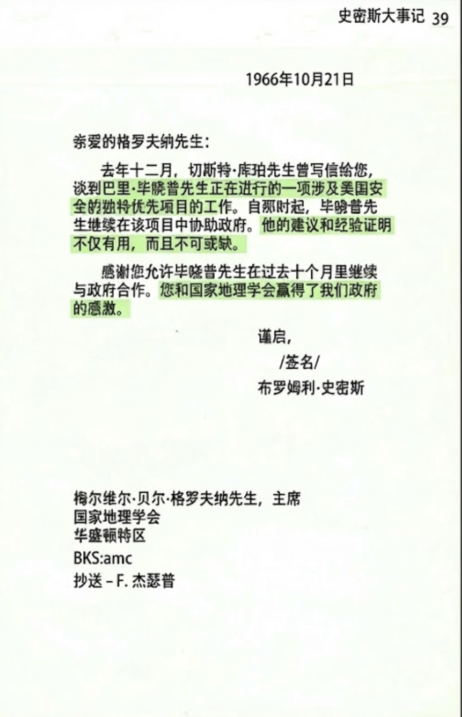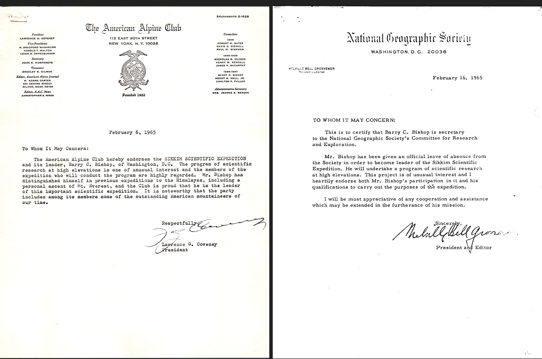 美国阿尔卑斯俱乐部和国家地理学会为毕晓普先生及其探险队出具的支持信。巴里·毕晓普遗产