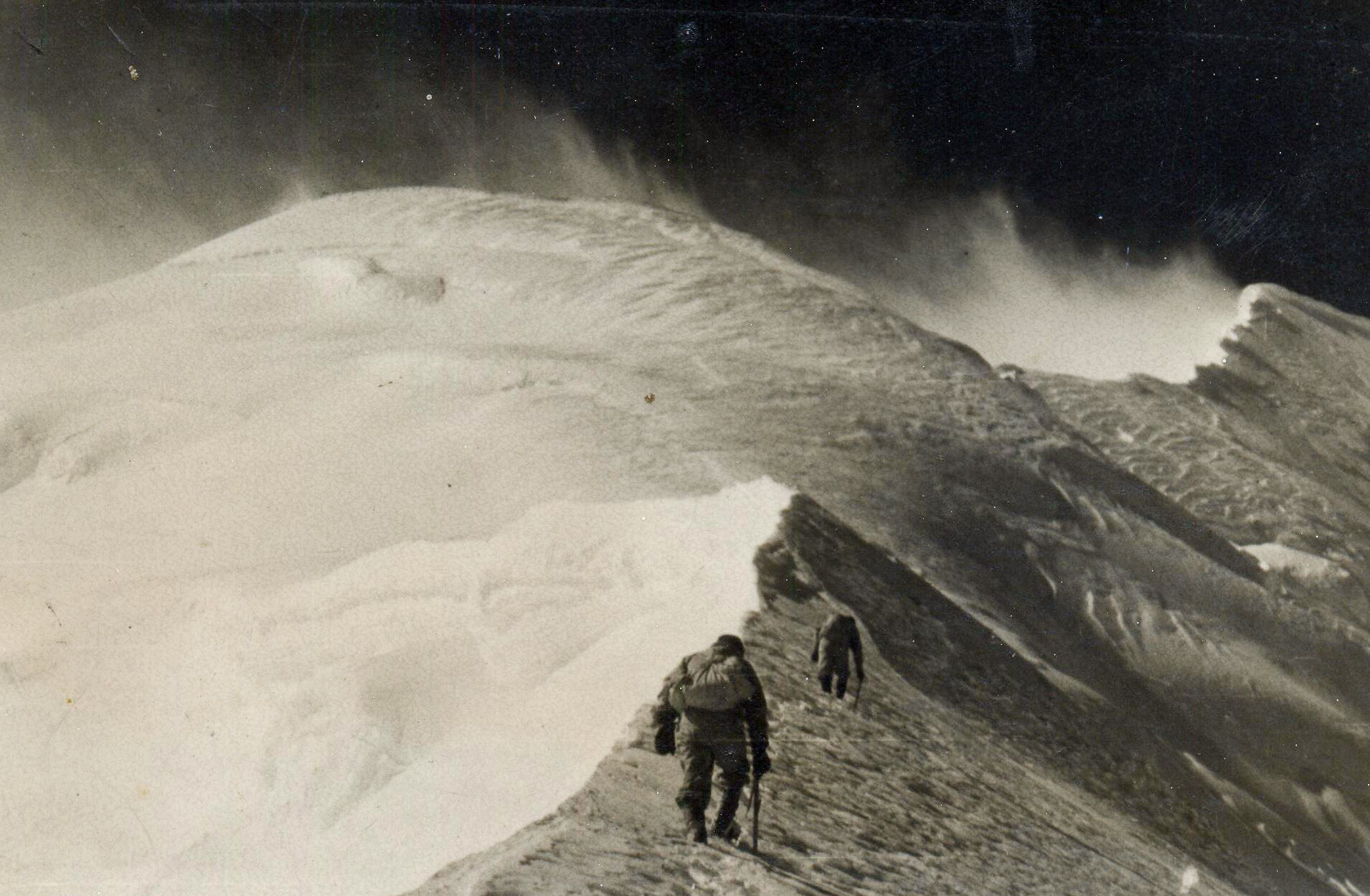 他们一步一步地在如剃刀般锋利的山脊上跋涉,狂风猛烈地拍打着他们的脸庞,冰爪在冰面上摇摇欲坠地抓抓着。只要走错一步,或者稍有不慎脚底一滑,就是坠入600米(2000英尺)的深渊,万劫不复。