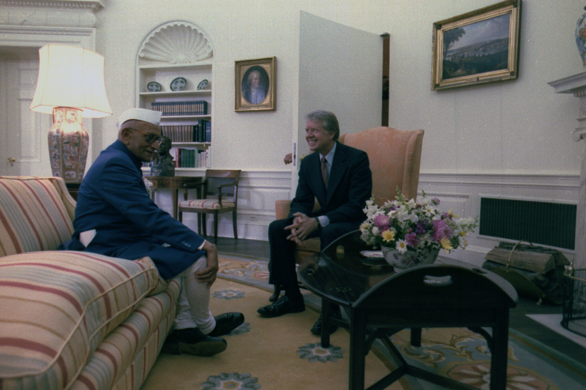 几周后,德赛先生走进白宫。一张照片显示他穿着清爽的蓝色夹克,戴着他那一代人的窄边白帽,坐在椭圆形办公室里,对面是满面笑容的卡特先生。十几名助手挤在周围。