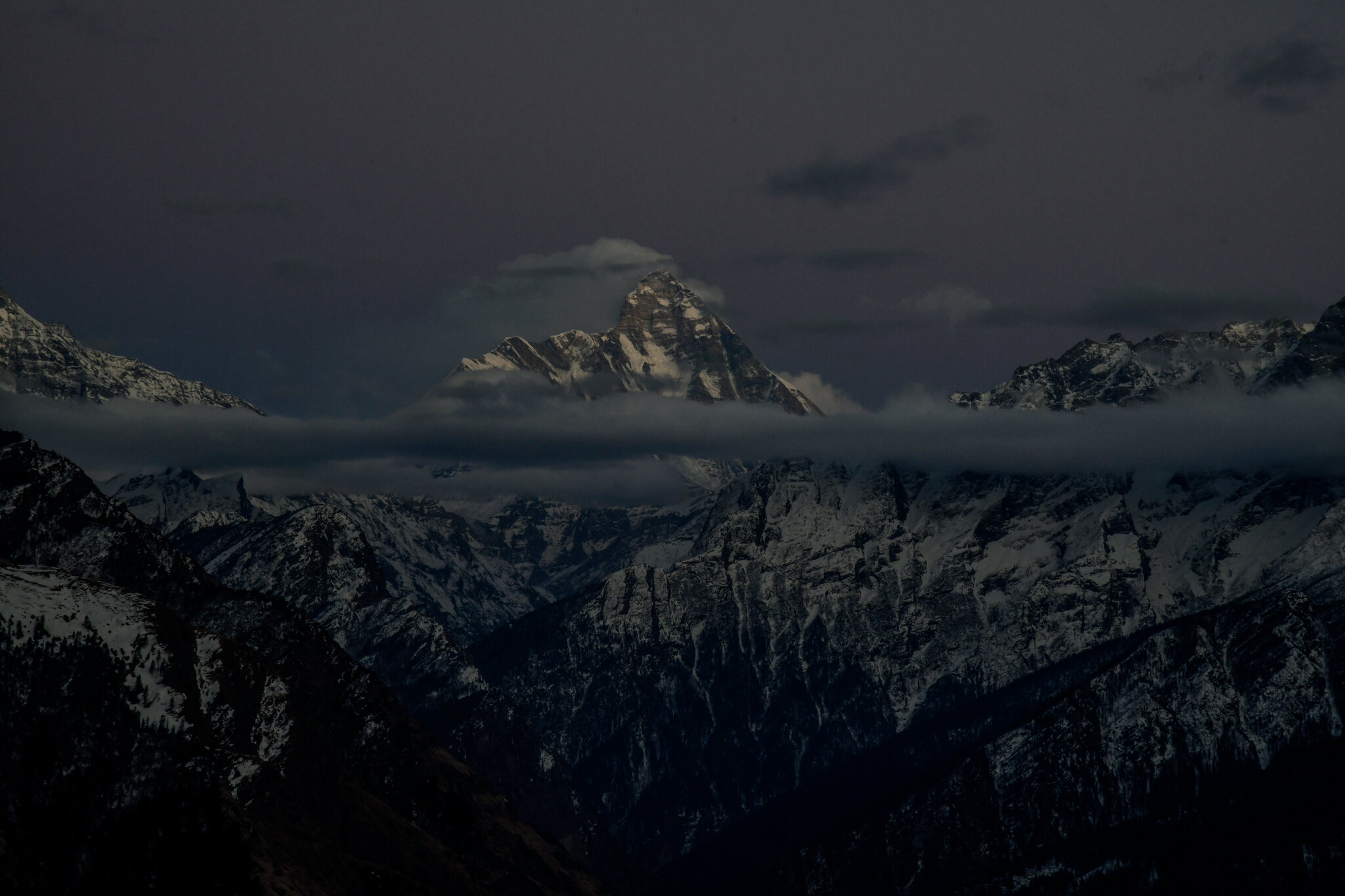 但是,就在登山者准备向顶峰冲刺时,天气突变。狂风呼啸,乌云压顶,一场暴风雪席卷而来,这座名为楠达德维山(Nanda Devi)的险峻山峰瞬间消失在白茫茫的一片之中。