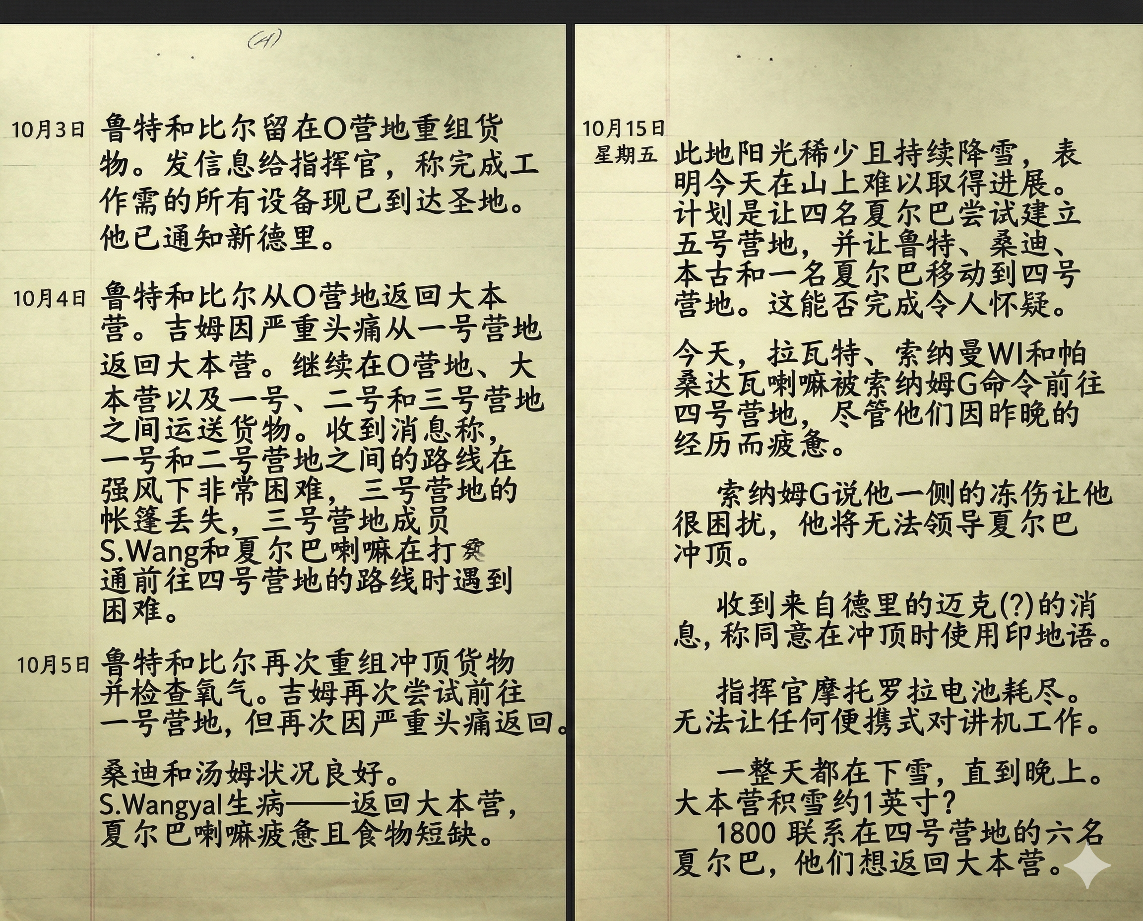 “四号营地,这里是前进大本营。能听到我说话吗?”他回忆起当时对着对讲机大喊的情景。
