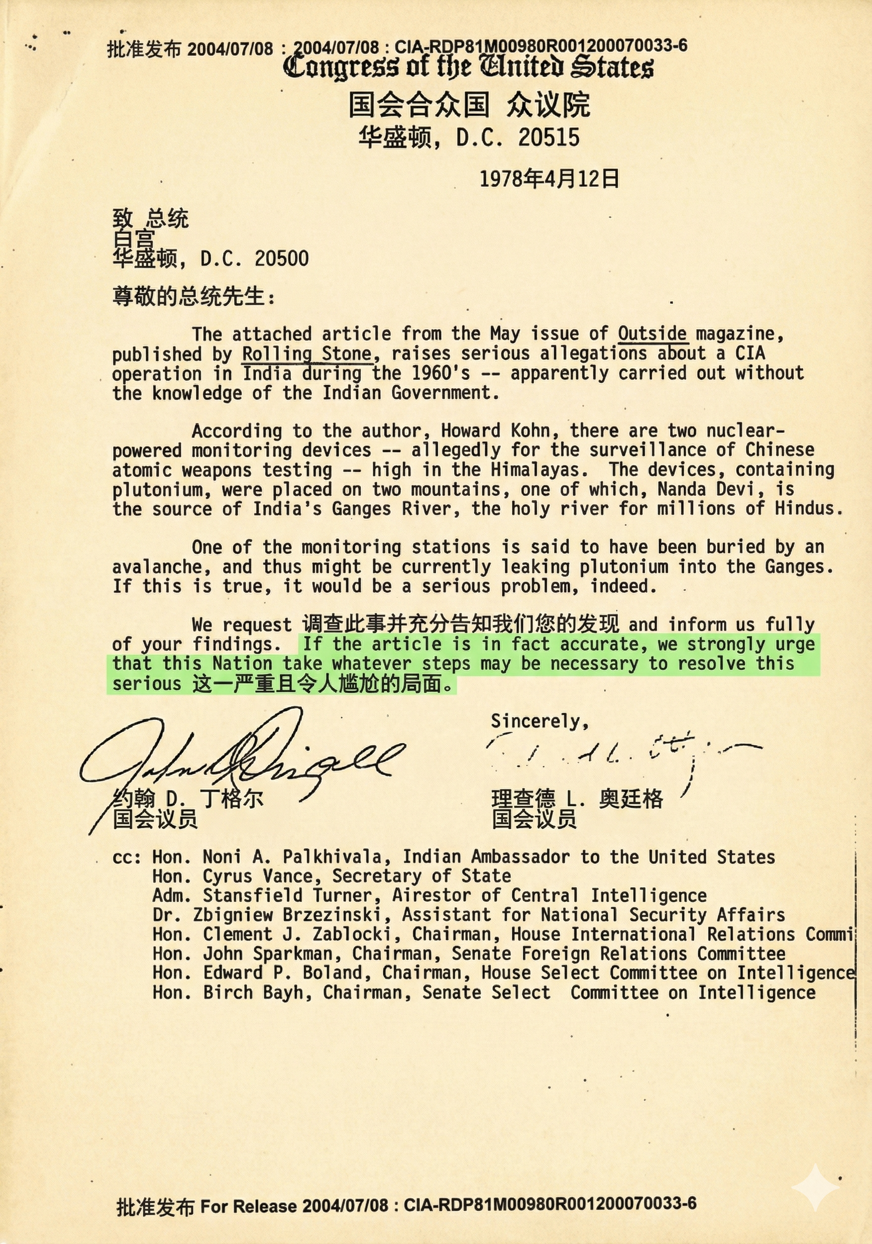 同一天,两位民主党众议员,密歇根州的约翰·丁格尔(John D. Dingell)和纽约州的理查德·奥廷格(Richard L. Ottinger),写信给卡特总统。